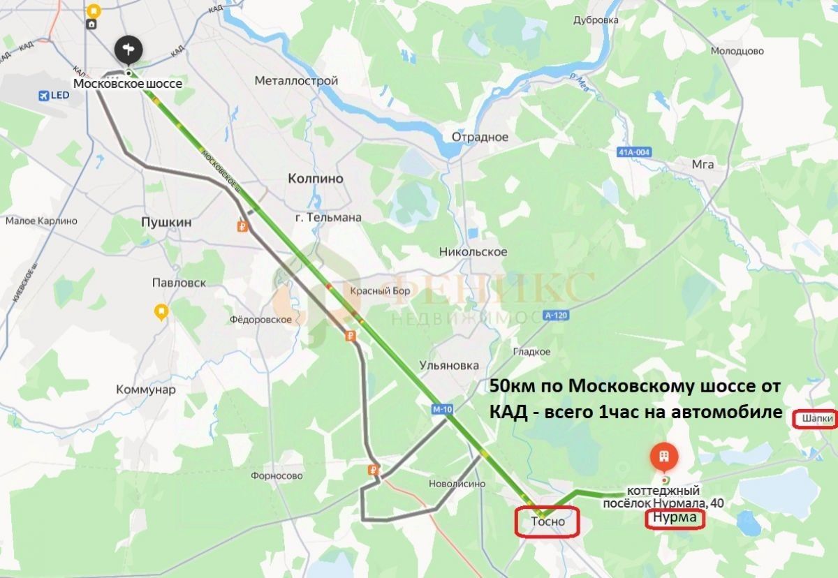 Транспортная доступность:На автомобиле - от метро Купчино время в пути на автомобиле 1 час (53 км).На электричке - до ближайшей ж/д станции Нурма 10 минут пешком, далее на электричке 1ч30мин до Московского вокзала либо 1ч10мин до ж/д станции и метро Обухово.На автобусе - автобусная остановка в 1,4км от участка. На автобусах 330, 330А, 337 можно доехать до Тосно (30мин), пересесть на 610 маршрутный автобус до Купчино.Инфраструктура:В 1.5км находится пос.Нурма с необходимой инфраструктурой: детский сад, школа, Пятерочка, амбулатория, аптека, OZON, Яндекс.Ближайший крупный населённый пункт в 10км - гор.Тосно со всей инфраструктурой для полноценной жизни: школа, детский сад, магазины Верный, Магнит, Дикси, Лента, Пятерочка и т.д., OZON, Wildberries, аптека, магазин цветов, больница, поликлиника, почта, отделение Сбербанка и тд.