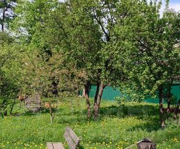 На участке - гараж, сарай, погреб. Фруктовые деревья, ягодные кусты и малинник. Теплица.