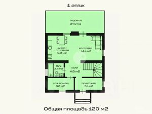 1 этаж: кухня-гостиная, прихожая, котельная, гардеробная, санузел с ванной.