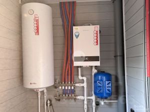 Отопление: электрокотел. На 1-м этаже полностью теплый пол (водяной), на 2-м этаже - радиаторы.
