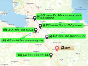 От дома ровно 5 минут пешком до ж/д станции "Саблино", электричка ходит каждые 15 - 30 минут. До центра города "Площадь Восстания" на электричке - 50 минут. До г. Колпино и г. Тосно - 20 минут на машине.