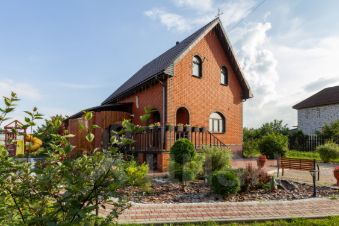 дорожки вымощены плиткой, с подсветкой. Все растения из питомника , в том числе молодые красные клены и туи. Много цветов (розы, пионы, гортензии). Плодовые деревья и кустарники, теплицы.