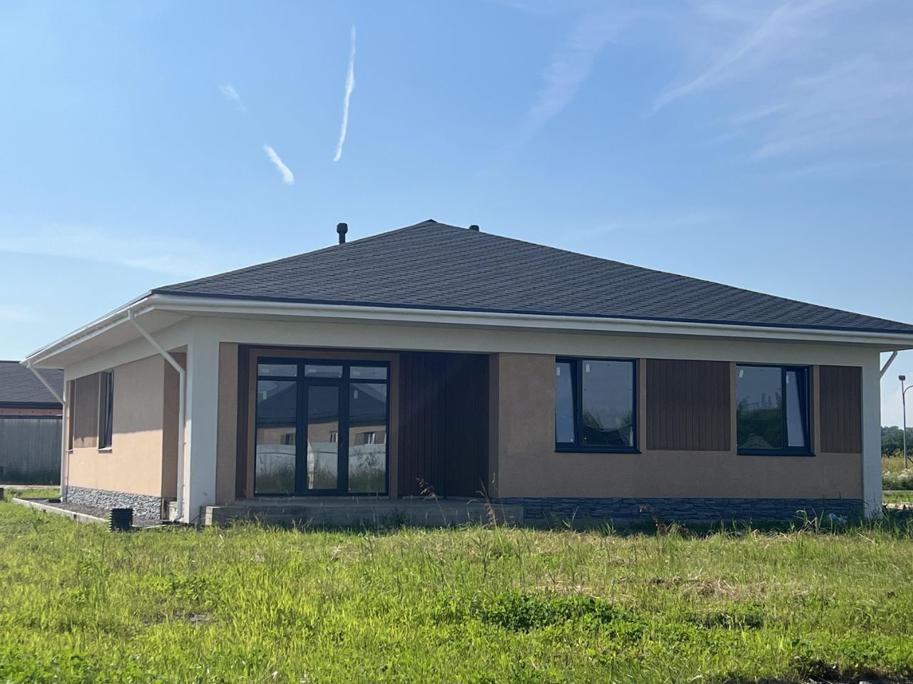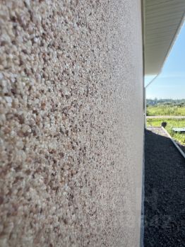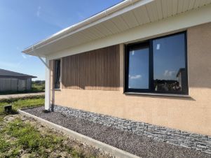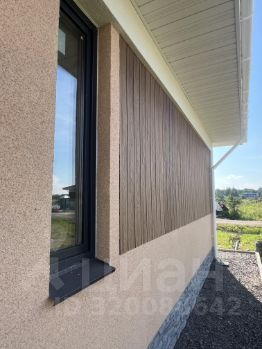 Отделка фасада мраморная штукатурка в сочетании с планкеном (лиственница), цоколь выполнен из натурального камня.