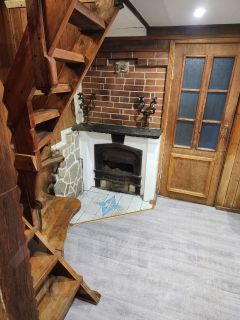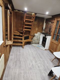 - Первый этаж: веранда (4,4 м²), прихожая (3,6 м²), кухня-столовая с действующей печью/камином (10 м²), комната (9,8 м²), комната (10,8 м²) без отделки