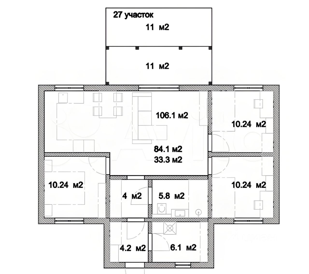 Площадь дома 84 м2 + терраса 20 м2 = 104 м2.