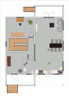 На первом этаже: прихожая, санузел, отдельная комната, просторная кухня-гостиная с камином, оборудованная всей необходимой мебелью и техникой. Из гостиной выход на крытую террасу.
