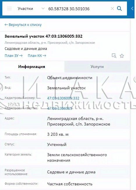 111755907 Меньшеза 10 соток. Участок можно разделить на несколько. Трасса А-121 Сортавала 77 км от КАД (Новоприозерское шоссе),минут на машине от КАД.Ленинградская область. Приозерский район, Запорожское сельское поселение, ул. Московская, участок 332 на карте. Участок граничит с СНТ "Тэйпл Плаза", можно заключить договор.Земельный участок 3203 кв. метра, ровный сухой, категория земель: Земли сельскохозяйственного назначения, разрешенное использование: Садовые и дачные дома.+ Электричество по границе участка+Газ рядомДостойные соседи.Рядом поселок Запорожское, поселок Сосново в 12 км: Школа, детский сад, сетевые магазины, МФЦ, банки, почта.Река Бурная, до Ладожского залива 10 минут на авто.60.587290,30.координаты