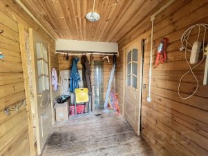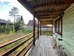 Две комнаты с выходом на веранду откуда открывается вид на участок и зеленые насаждения.