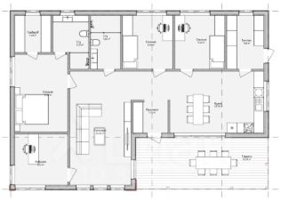 Просторная зона кухни-столовой и гостиной с панорамными окнами, 4 спальни, 2 санузла, гардеробная, прихожая, техническое помещение.