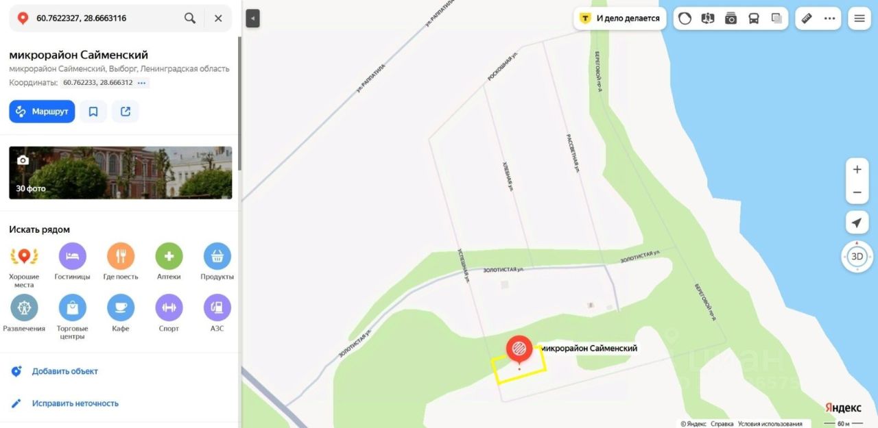 Продается участок 10 соток в мкр. Сайменский города Выборга. Великолепное место для отдыха или постоянного проживания, тишина и покой — ни шума города, ни суеты. Участок правильной формы, произведено межевание, подъезд по грунтовой дороге. Автобусная остановка в пешей доступности. Кадастровый номер 47:01:0101007:43. Ленинградская область, г. Выборг, мкр. Сайменский, участок 109. Координаты широта 60.7622327, долгота 28.6663116