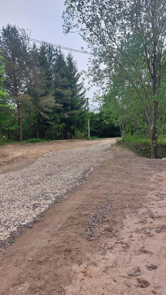 Дорога в посёлок-бетонка, к участку широкий подъезд, на участке дорога отчыпана гравием.