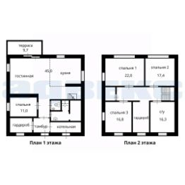 Удачная планировка дома позволяет проживать членам большой семьи не стесняя друг друга - 4 спальни (11,02/22,04/17,48/16,8 кв.м), 2 гардеробные, сауна, и главная фишка этой планировки - это огромная кухня-гостиная площадью 45 кв.м - всё это создаёт благоприятные условия для комфорта и совместного времяпровождения в кругу дружной семьи.