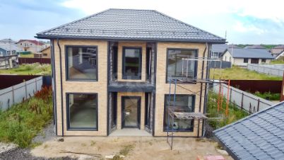 Просторный современный дом площадью 220 м² расположен на благоустроенном участке 6 соток в тихом и удобном районе. Двухэтажное здание построено из полистеробетонных блоков с внешней отделкой облицовочным камнем, что обеспечивает высокую теплоизоляцию и долговечность. Большие панорамные окна наполняют помещения естественным светом, создавая ощущение простора. Дом находится в высокой степени готовности: возведены стены, установлены перегородки, остались только отделочные работы, что позволяет новым владельцам адаптировать интерьер под свои предпочтения без необходимости масштабного строительства.