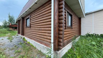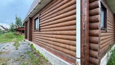 78,3 м² из оцилиндрованного бревна с дизайнерскими элементами, Фундамент: на винтовых сваях с обвязкой лентой, Крыша: металлический профнастил.