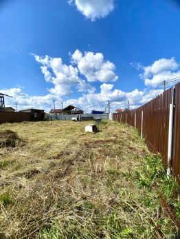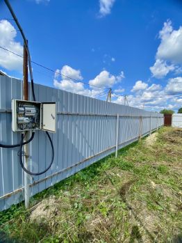 Участок угловой, соседи только с двух сторон, полностью огорожен забором, распашные ворота и калитка.