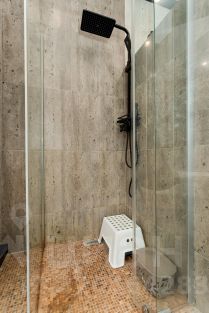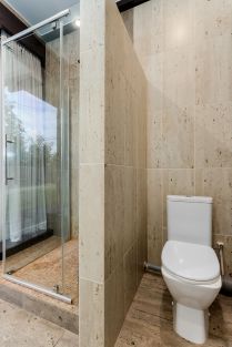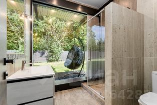 - Санузел с душевой кабиной и окном с видом на зелень.