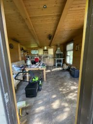 - Летняя кухня (каркасная, фундамент - лента) 25м2 с финским стационарным мангалом.