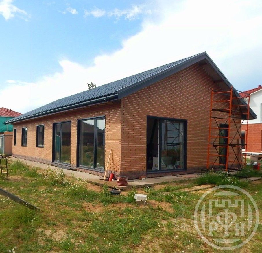 Фундамент - плита, стены - газобетон, снаружи клинкерная плитка, крыша- металлочерепица. Построен по проекту.