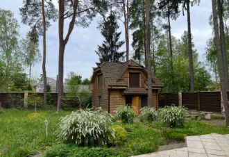 Ухоженная территория с высокими соснами, плодовыми деревьями, кустами смородины и жимолости