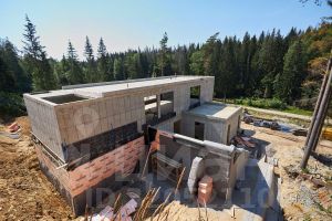 Фундамент дома - монолитная железобетонная теплоизолированная плита (марка бетона В30) с заложенными коммуникациями, контуром заземления, дренажной системой и каналами для прокладки кабелей освещения прилегающей к дому территории. Прозрачные стены первого и второго этажей выполнены из двухкамерных стеклопакетов, заполненных аргоном в алюминиевых рамах. Внутреннее стекло закаленное, селективное, центральное F-стекло, внешнее закаленное, солнцезащитное. Глухие стены сделаны из газобетона толщиной 400 мм. Крыша монолитная с наплавляемой кровлей.