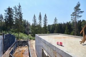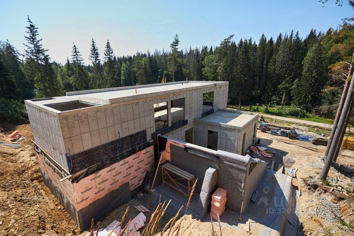 Фундамент дома - монолитная железобетонная теплоизолированная плита (марка бетона В30) с заложенными коммуникациями, контуром заземления, дренажной системой и каналами для прокладки кабелей освещения прилегающей к дому территории. Прозрачные стены первого и второго этажей выполнены из двухкамерных стеклопакетов, заполненных аргоном в алюминиевых рамах. Внутреннее стекло закаленное, селективное, центральное F-стекло, внешнее закаленное, солнцезащитное. Глухие стены сделаны из газобетона толщиной 400 мм. Крыша монолитная с наплавляемой кровлей.