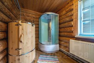 На 1-ом этаже расположены: входной тамбур 2.6 м2, прихожая 3,5 м2 с гостевым холлом 10,4 м2; котельная 9.4 м2, в которой установлены газовый котел; электрический котел и бойлер; сауна 5,1 м2; ванная комната 9,3 м2 с санузлом, душевой кабиной и кедровой бочкой; просторная столовая-гостиная 40,5 м2 с выделенной кухонной зоной и выходом на террасу 9.4 м2; спальня 13.7 м2.