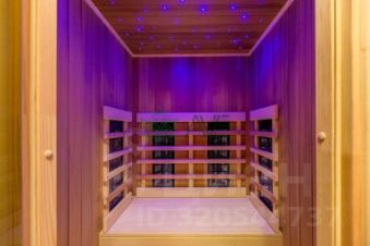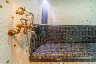 - Дизайнерский санузел с балконом, в котором есть ванна, душ, раковина и небольшая спа-зона, включающая в себя хамам и инфракрасную сауну,