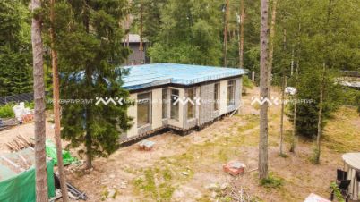 Основной дом готов на 60-70%: снаружи осталось поставить дверь, обшить цоколь и софиты, внутри — голые стены под отделку. Есть готовый проект и приобретённый газовый котёл. Все коммуникации подведены: газ, вода, электричество 20 кВт, установлен септик и резервный генератор.