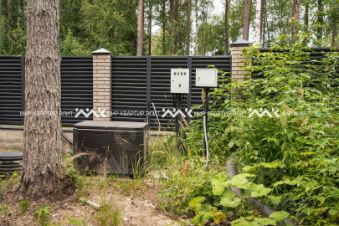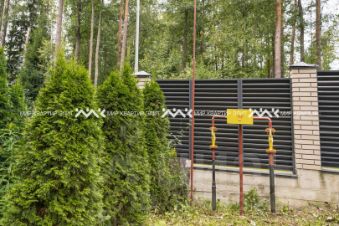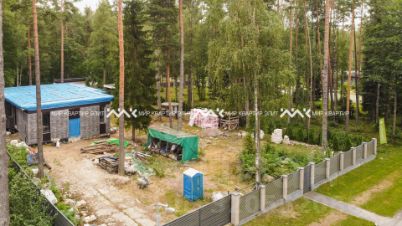 Участок 20 соток расположен вторым от дороги в окружении деревьев и черничника, полностью огорожен забором с откатными воротами 8 метров. Удачное расположение рядом с КПП обеспечивает быстрый выезд из посёлка.