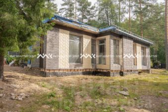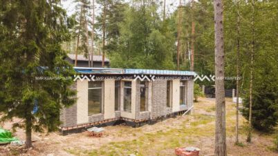 Основной монолитный дом в стиле хайтек включает первый этаж 152 м² и цокольный 135 м². Построен без экономии на материалах: монолит с заполнением из газобетона, облицовка камнем, все окна установлены.