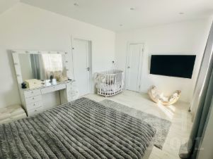 1. Хозяйская просторная спальня с отдельным помещением под гардероб(гардеробная система установлена). Большая 2 спальная кровать, тумбы и телевизор.