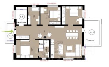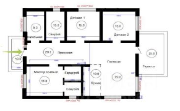 В доме три спальни (15 м2, 15 м2, 16 м2), кухня-ниша занимает 10 м2, гостиная 29 м2.
