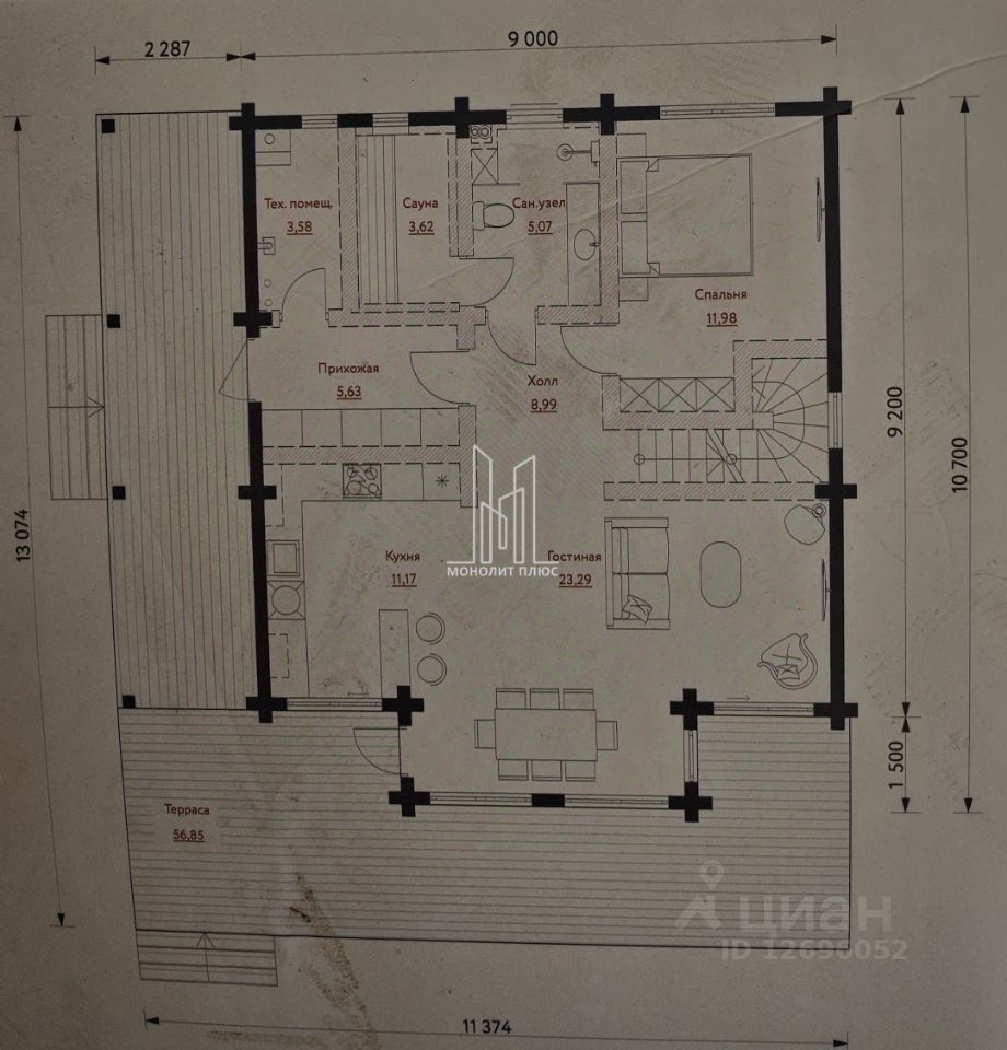 1-ый этаж: кухня- гостинная 35м2 с выходом на террасу, спальня 12м2, сан. узел 5м2, сауна 3.67м2, котельная 3.58, второй выход. Терраса 57м2