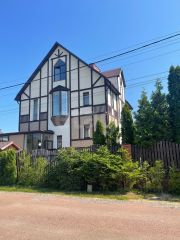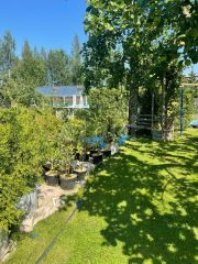Очень интересное предложение. На участке в 3 000 квадратных метров построены два дома. Один жилой двухэтажный пятикомнатный дом общей площадью около 340 метров квадратных. Построен в 1995 году. Жилая площадь 156 метров квадратных. На первом этаже гостиная с камином 27,9 кв. метров, спальня 13 метров, кухня 13 метров, передняя 4,6 метров. Уборная1,1 метров. Прихожая 12 метров. Терраса 7 метров