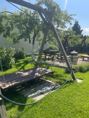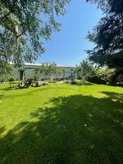 На краю участка имеется добротное утепленное строение из сэндвич-панелей площадью около 220 метров. 54 метра можно отапливать, при необходимости, котлом на дизельном топливе. Температура, в части, которая не отапливается, зимой никогда не опускается ниже трех градусов мороза. Летом в помещении всегда прохладно. В настоящее время используется как хоббийная столярная мастерская. Можно использовать под гараж или другие цели. Мастерская гармонично вписывается в ландшафт.