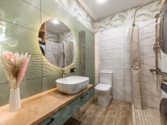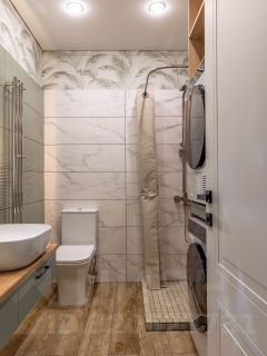 Просторная гостевая уборная с душевой, стиральной и сушильной машинами и практичная прихожая.