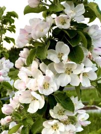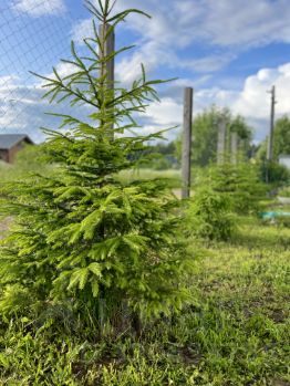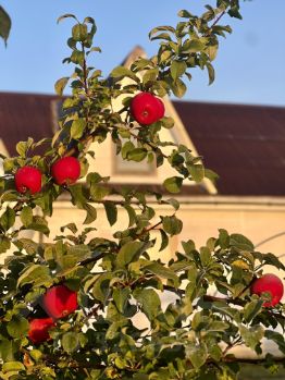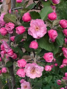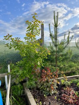 **Молодой плодоносящий сад** — яблони, груши, сливы, вишни , облепиха, цветущие кустарники на участке , сортовые розы, ели