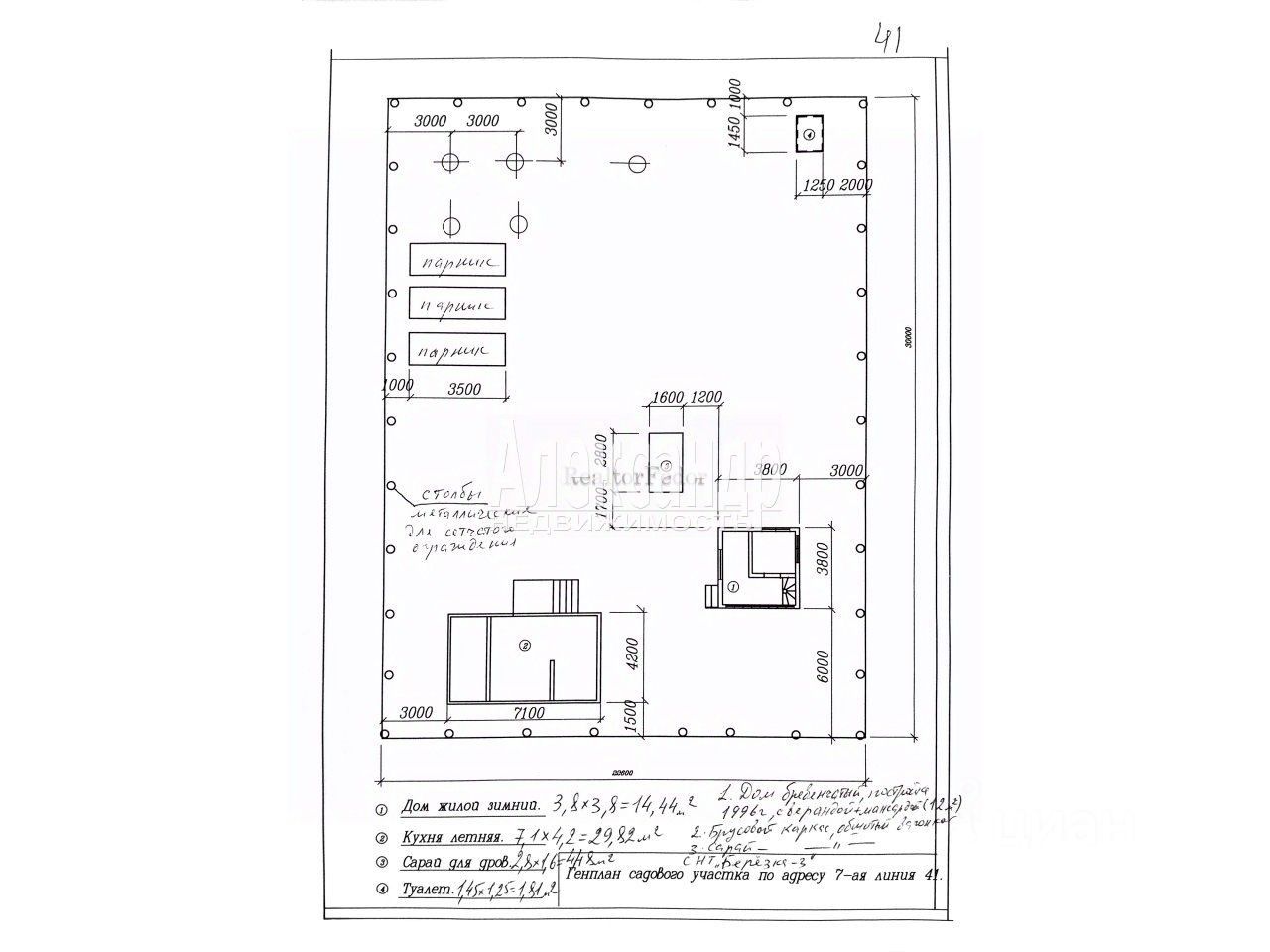 Дополнительные постройки: помимо основного дома, на участке расположен просторный летний/гостевой дом 7,1х4,2 м, сарай 2,8х1,6 м, 3 парника и туалет.