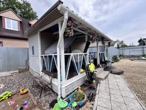 На участке есть хозяйственный блок для хранения инвентаря, и при нем есть терраса, которая служит отличной крытой беседкой. Есть качели.