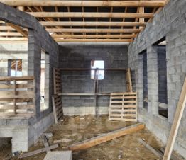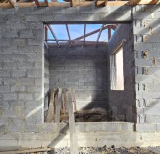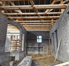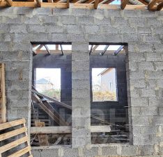 Фундамент - винтовые сваи, обвязанные лентой (на фото всё показано). Материал стен - керамзитобетон (на авто просто нет данного вида материала), 350 мм. Крыша - металлочерепица. Все материалы заказывали сами. Всё проверено! Свет подключен! Септик, скважина - место продумано.