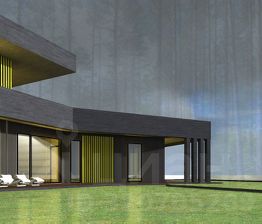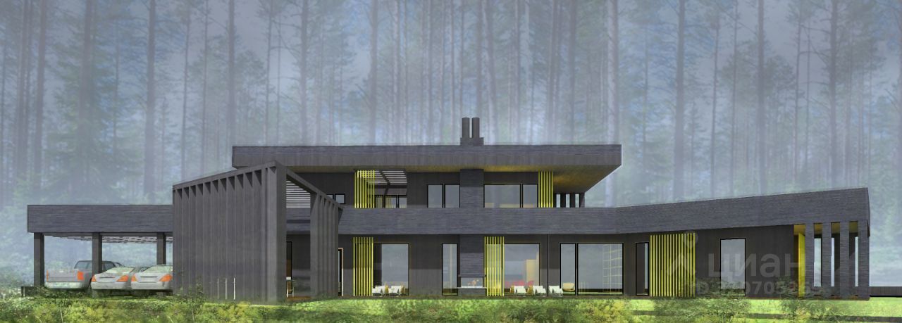 Проект с панорамными окнами, мастер-спальней с закрытой террасой и видом на лес.