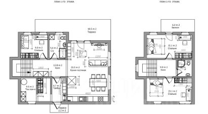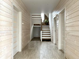 Первый этаж состоит из: прихожей, из которой попадаем в гардеробную, а затем в котельную. Из прихожей так же попадаем в холл, из которого можно попасть в санузел, кабинет или просторную кухню гостиную с панорамными окнами с высотой потолков 5 метров и выходом на террасу.