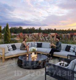 Просторная Урбан-Вилла, общей площадью 98,83 кв м, на первом этаже расположена Кухня-гостинная 26.8 кв м с выходом на террасу, Техническое помещение -7.77 кв м, Просторный холл - 8.8 кв м, Санузел с окном - 4.42 кв м. На втором этаже 2 изолированные мастер-спальни: 17.84 кв м с санузлом и 15.76 кв со своей гардеробной, санузлом и выходом на балкон