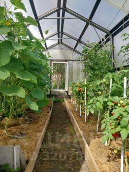 Участок высокий, ровный, высажены плодово-ягодные кусты и деревья, туи и парник.