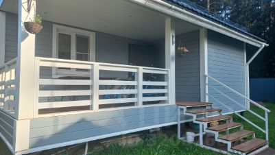 В доме на 1-м эт. кухня-гостиная, спальня и санузел с бойлерной, на 2-м этаже - две спальни и кладовая. Есть терраса 9.5 м.кв. Участок крайний к лесу, есть собственный выход в лес через калитку.