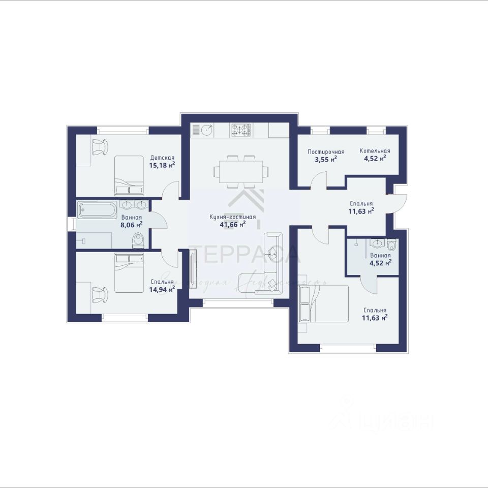 Просторная кухня-гостиная с выходом на крытую террасу, 3 изолированные комнаты (одна из них - мастер-спальня с гардеробной и санузлом), котельная и постирочная, 2 санузла