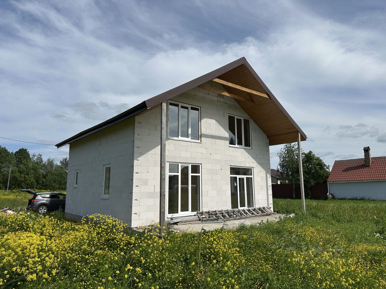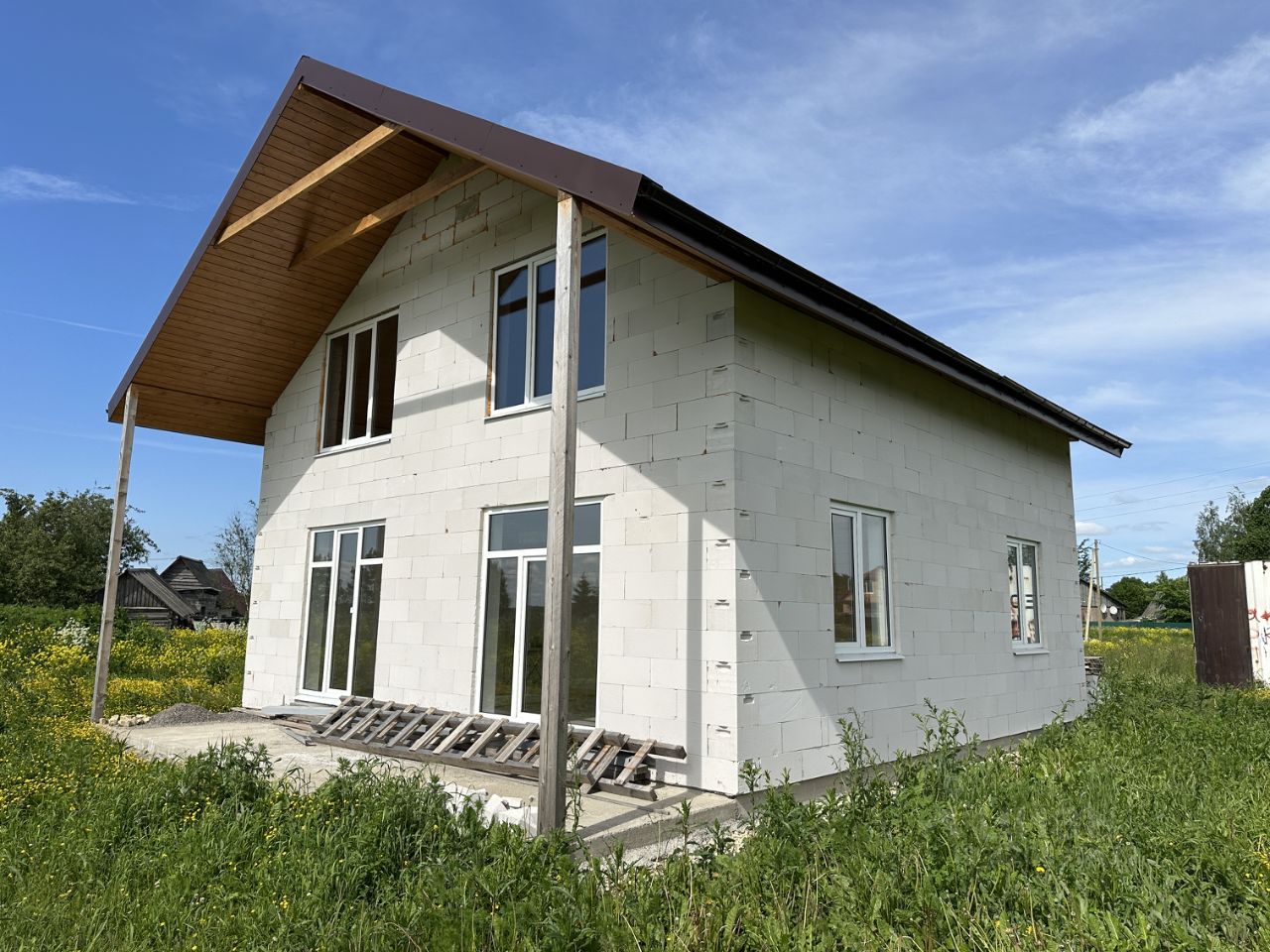 Дом стоит на монолитной железобетонной плите. Блоки компании ЛСР, толщина 300 мм. Стеклопакеты двухкамерные, входная дверь с терморазрывом. Свой подъезд к дому. Электричество 3 фазы, 7 киловатт. Вода из собственной скважины.