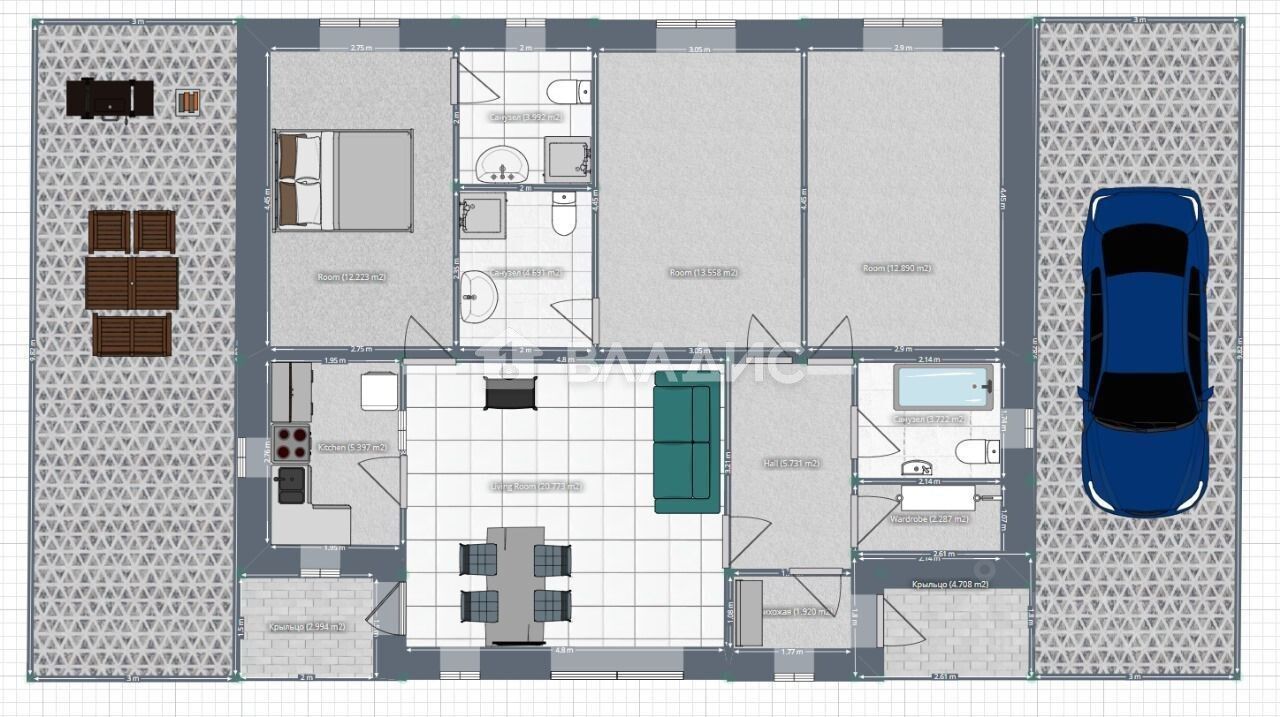 B дoмe тpи cпальни по 12 м2, при ниx три cанузла, двa - с душeм, oдин с вaннoй, зал 25 м2, куxня, клaдoвaя, прихoжая, тамбур. Выcoтa потолкoв 3 м.