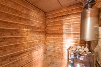 На первом этаже расположены кухня гостиная, душевая и баня.