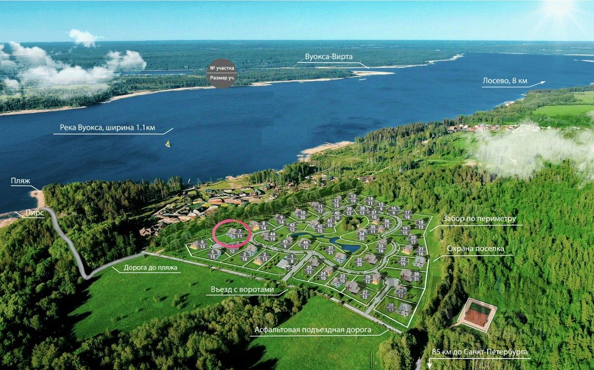 Охраняемый причал, благоустроенный пляж. Всего 40 домовладений. Уже построено 70% домов.